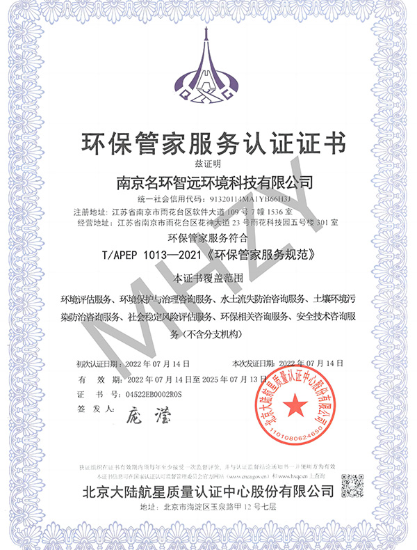 南京名環智遠環境科技有限公司 南京名環智遠環境科技有限公司定位為專業生態環境技術服務提供商,基于先進的生態與環境保護技術研發、應用和綜合服務能力,為客戶提供生態與環境保護領域的管理與技術咨詢服務、環境工程全流程綜合解決方案以及環保高新技術成果轉化與產業化運作,致力于為政府、園區和企業提供生態保護與污染防治“全過程”、“全方位”、“全覆蓋”的一站式綜合服務。公司目前是中國環境保護產業協會、中國環境科學學會、江蘇省環境保護產業協會、江蘇省環境科學學會土壤和地下水修復專業委員會、江蘇省水土保持學會、南京市環境保護產業協會等協會理事和南京市政法委重大決策社會穩定性評估機構。公司目前已取得若干專利,通過了質量、環境和職業健康管理體系認證和高新技術企業認定,在技術研發、業務實踐應用等方面形成了雄厚的積累。 公司作為“政府環保智庫、園區環保顧問、企業環保管家”,南京名環智遠為各級政府、園區、3000余家企業提供了污染防治與生態保護綜合服務和解決方案,具體包括水污染治理、大氣污染治理、土壤修復、固體廢物處置、環境影響評價、節能評估、可行性研究、環境規劃、環保驗收、清潔生產、危廢鑒別等。